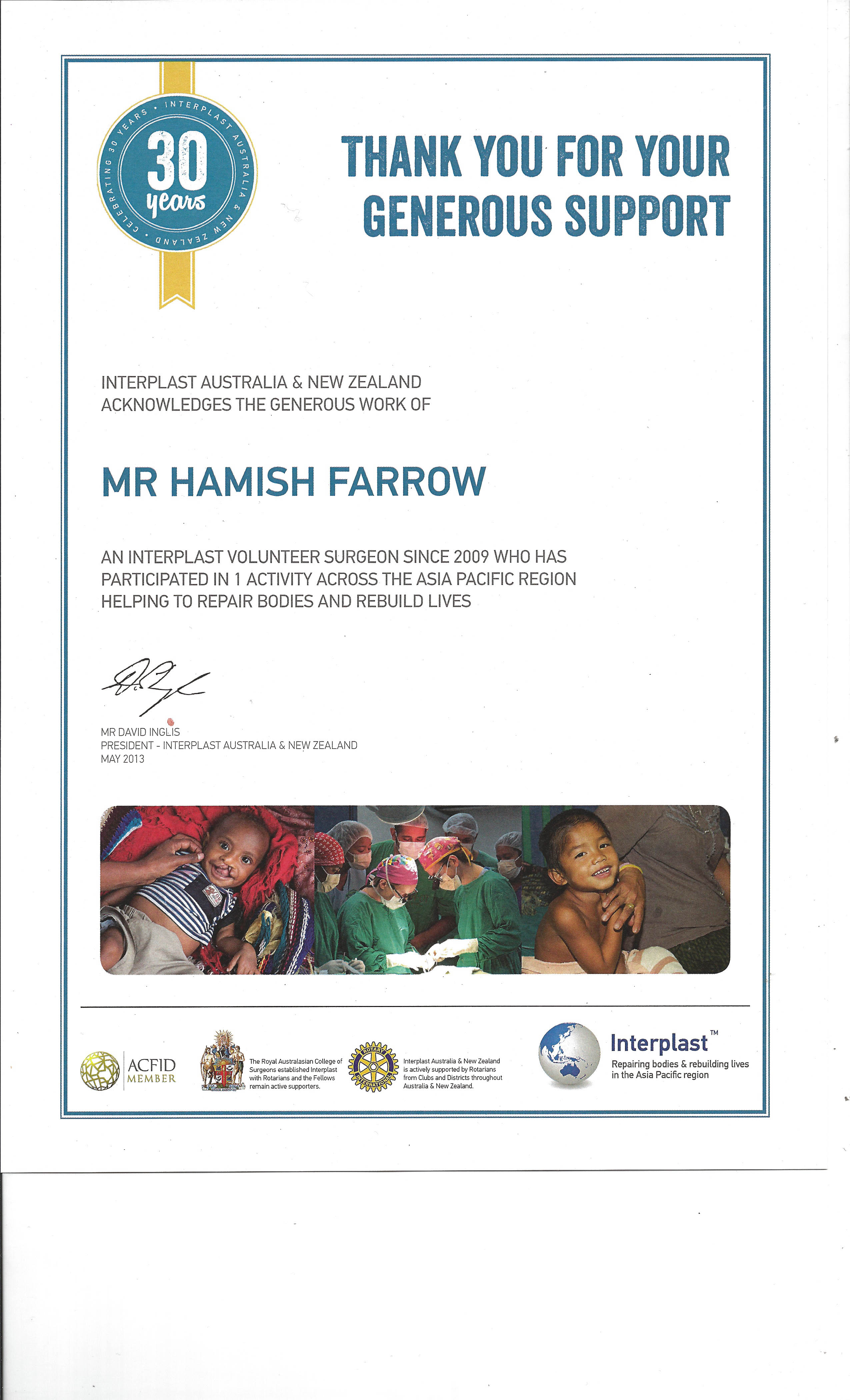 Achknowledgement of Hamish’s time in Fiji with the Interplast team. Great to see Hamish’s photo has made it onto the certificate. Maybe it is the great surgical cap?